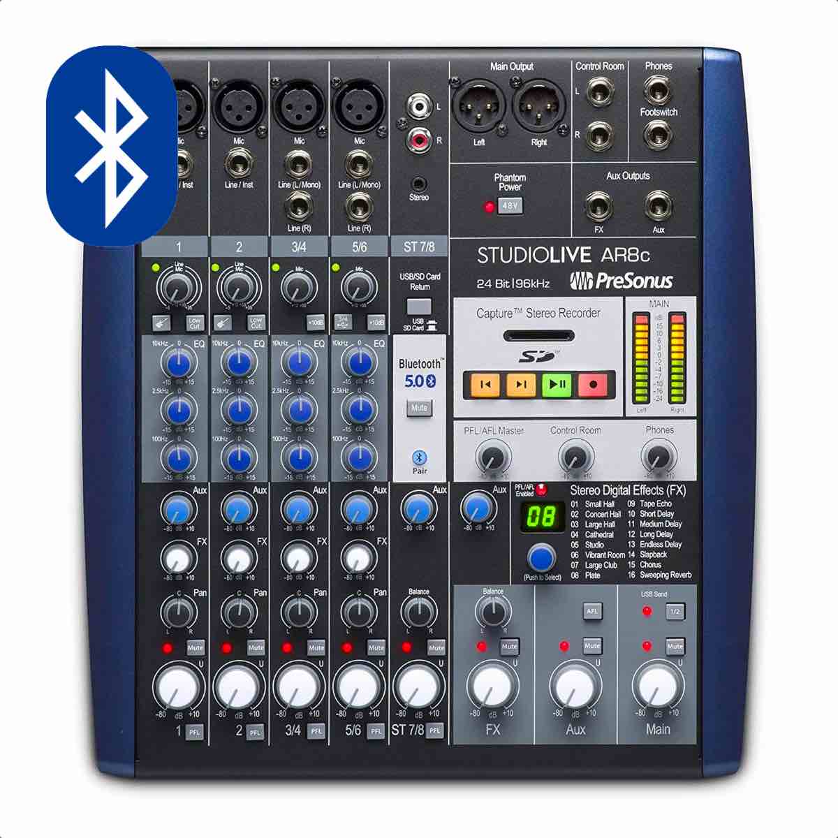 With its instantly familiar analog mixer design, the StudioLive® AR8c is the easiest way to record podcasts, live streams, and music productions. Featuring a pristine analog front-end with four high-gain XMAX mic preamps and an 8×4 24-bit, 96 kHz, USB-C compatible USB 2.0 audio interface, the StudioLive AR8c’s hybrid design makes it simple to record from a single intuitive console. Add in tools like a musical 3-band analog EQ, mic/line boost for low-level broadcast microphones and consumer devices, Bluetooth® connectivity, and a stereo SD recorder… and you have a broadcasting and recording powerhouse that fulfills the needs of both modern musicians and content creators.